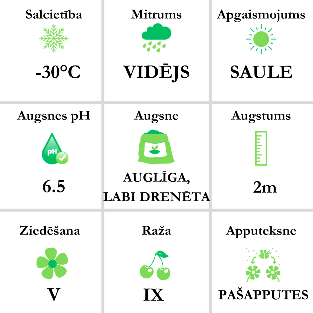 Ogas - tumši violetas/purpurmelnas, 1-1.5cm diametrā, saldas ar mīkstu mizu. Nogatavojas septembrī.