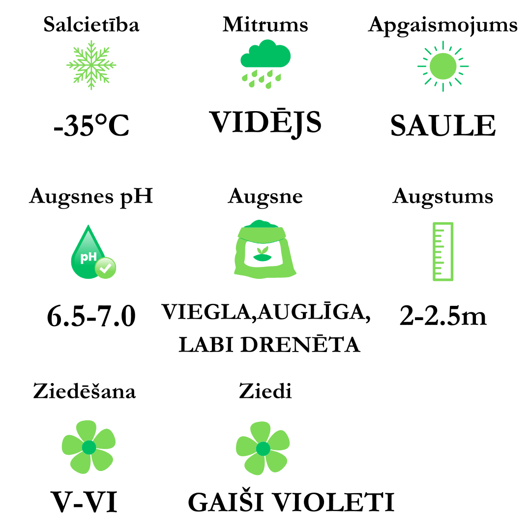 Ziedi - ļoti smaržīgi, gaiši violeti. Ziedkopas līdz pat 15cm lielas. Zied maijā.