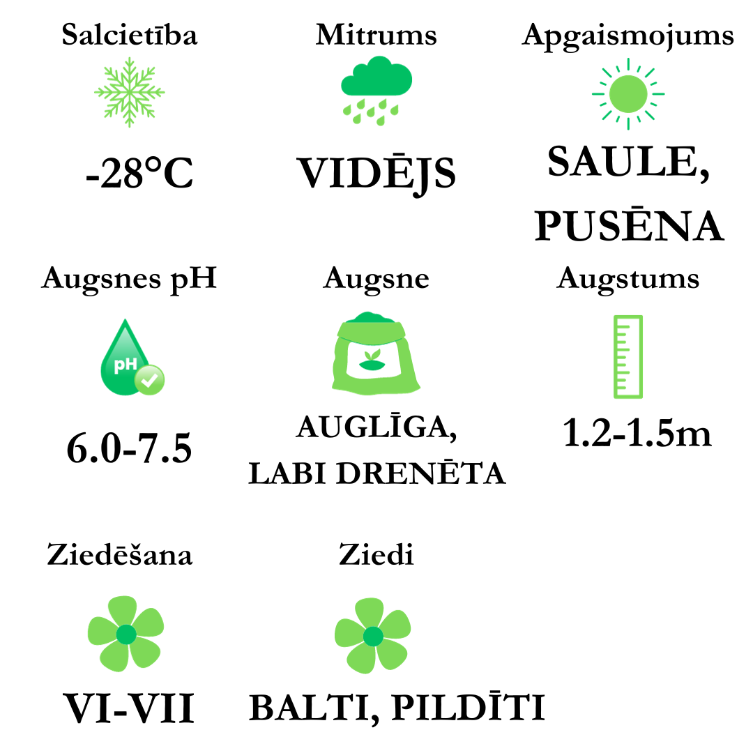 Ziedi - lieli (līdz 4cm), balti, pildīti, smaržīgi. Zied bagātīgi jūnijā-jūlijā.