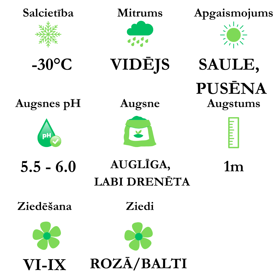 Ziedi - ziedi ar dubultām ziedlapiņām, kam ārpuse ir fuksijas rozā, bet iekšpuse balta. Ziedēs no jūnija/jūlija līdz septembrim.