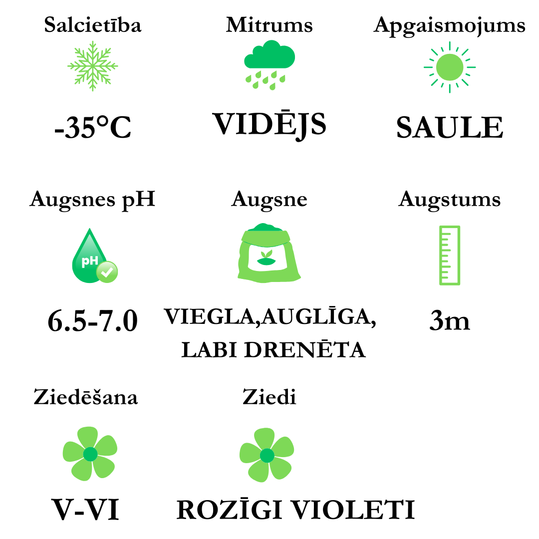 Ziedi - purpurkrāsas pumpuri, kas atveras kā rozīgi violeti ziedi, ļoti smaržīgi. Zied maijā.