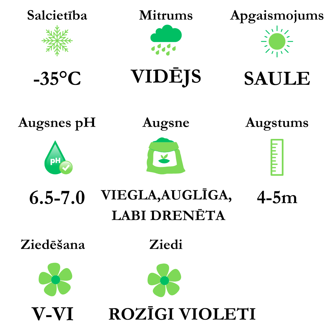 Ziedi - gaiši violeti pumpuri, kas atveras kā rozīgi violeti ziedi, ļoti smaržīgi. Zied maijā.