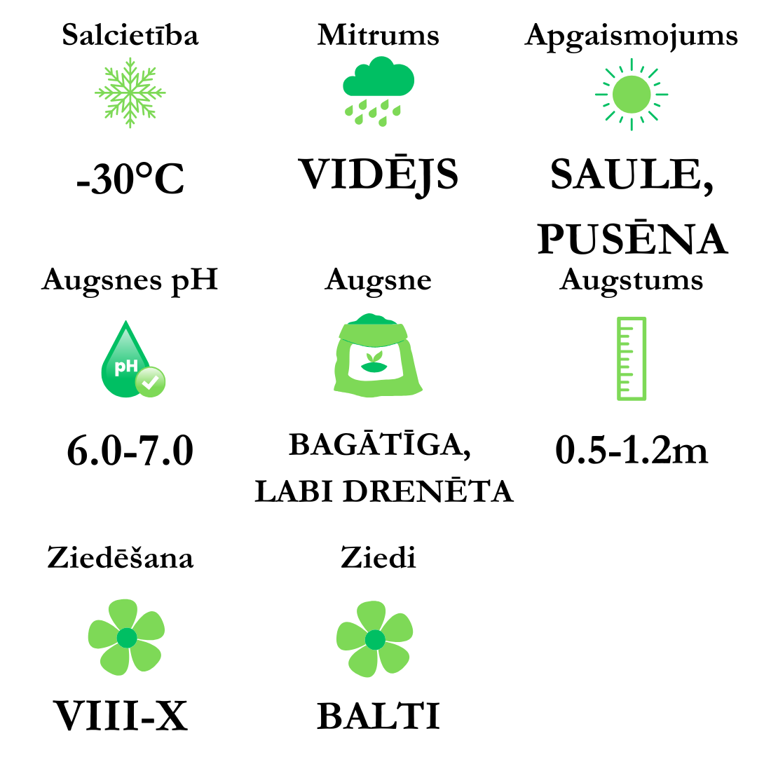 Ziedi - balti. Sāk ziedēt vasaras beigās un priecē līdz salam.