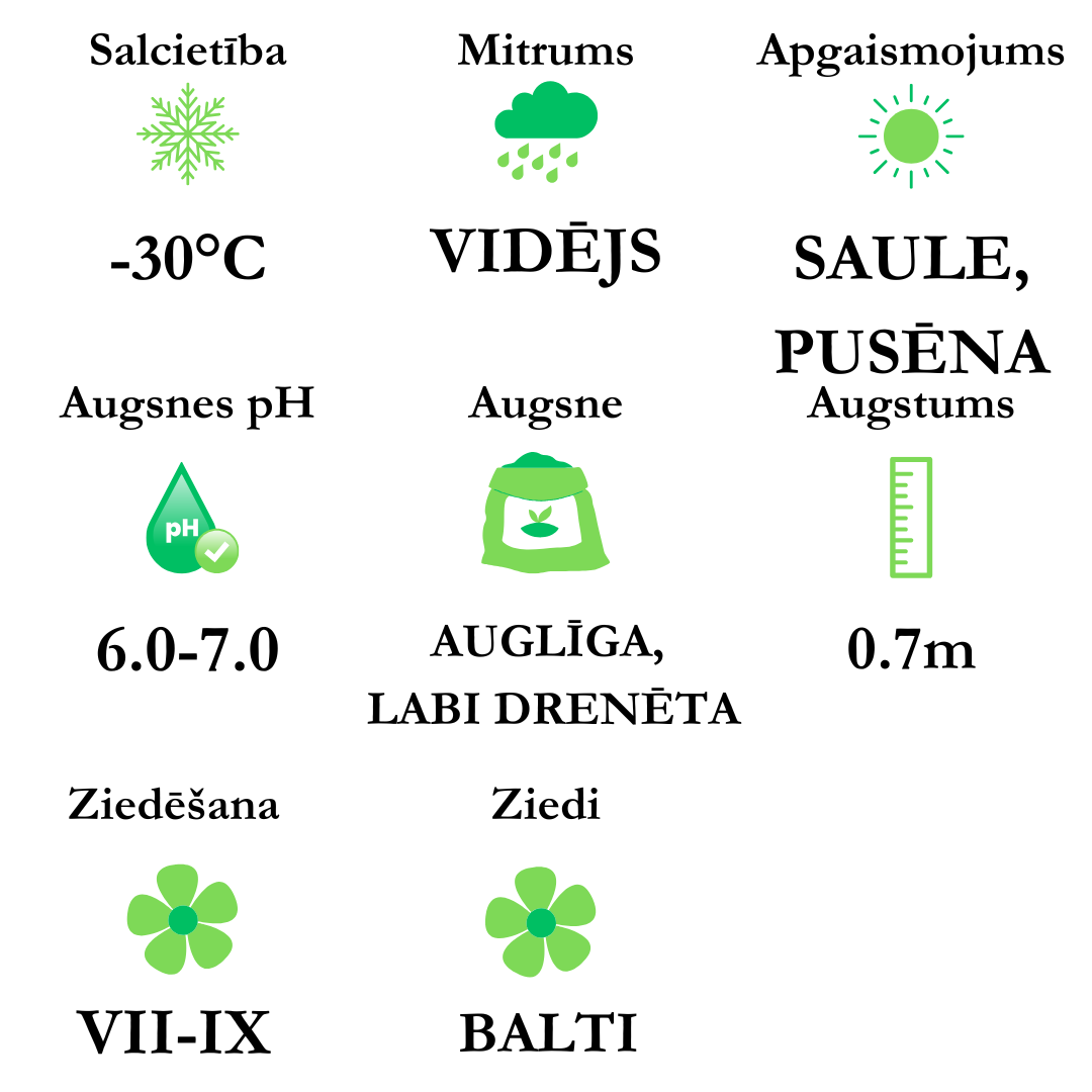 Ziedi - balti, zied jūlijā/septembrī