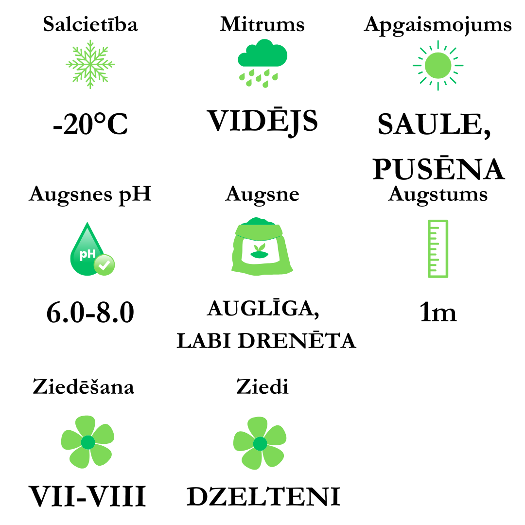 Šis daudzgadīgais augs ir gaismas mīlošs, jo pilna saule nodrošina kompaktu augumu un bagātīgu ziedēšanu ar dzelteniem ziediem. Augsnei jābūt smilšainai vai vidēji auglīgai, ar labu drenāžu, jo flome necieš pārmērīgu mitrumu, bet ir ļoti izturīga pret sausumu. Dārzā tā labi sader ar lavandu, kaķumētru, rudbekijām un graudzālēm, radot dabisku, strukturētu un ilgi dekoratīvu kompozīciju, kas saglabā pievilcību arī ziemā ar savām dekoratīvajām lapām.