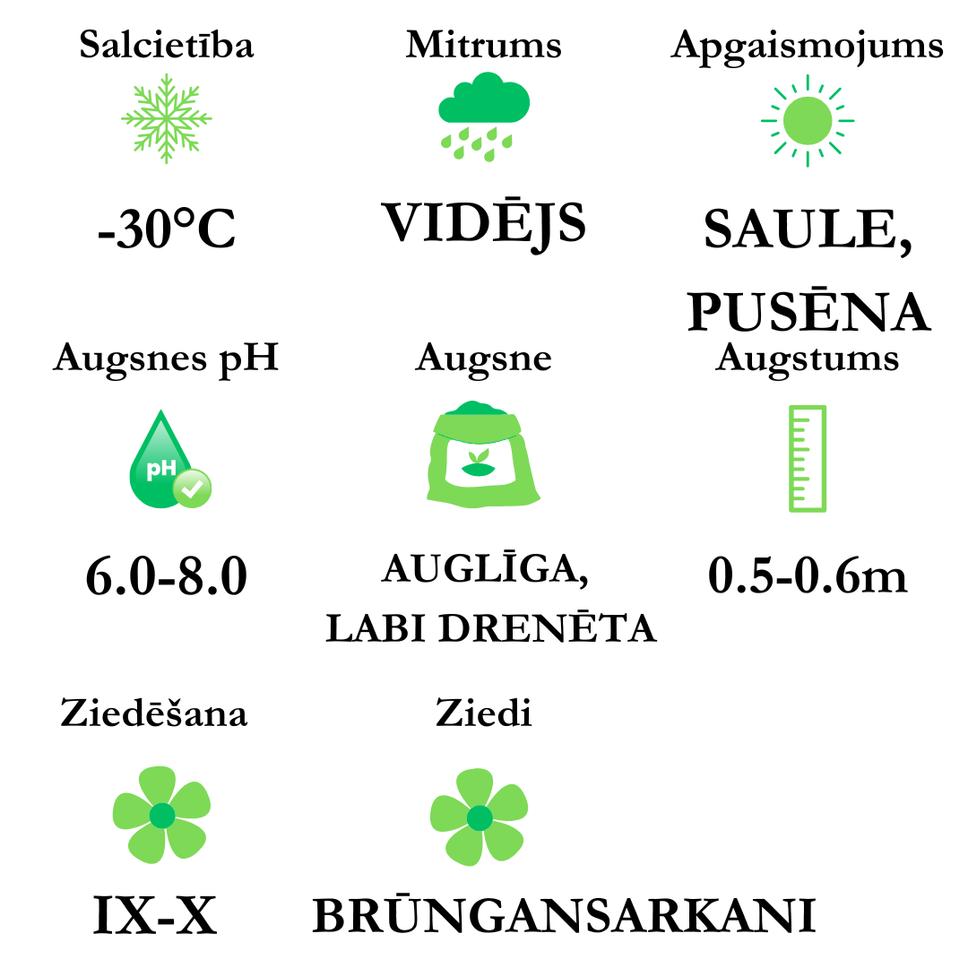 Ziedi - brūngansarkani, zied septembrī-oktobrī.