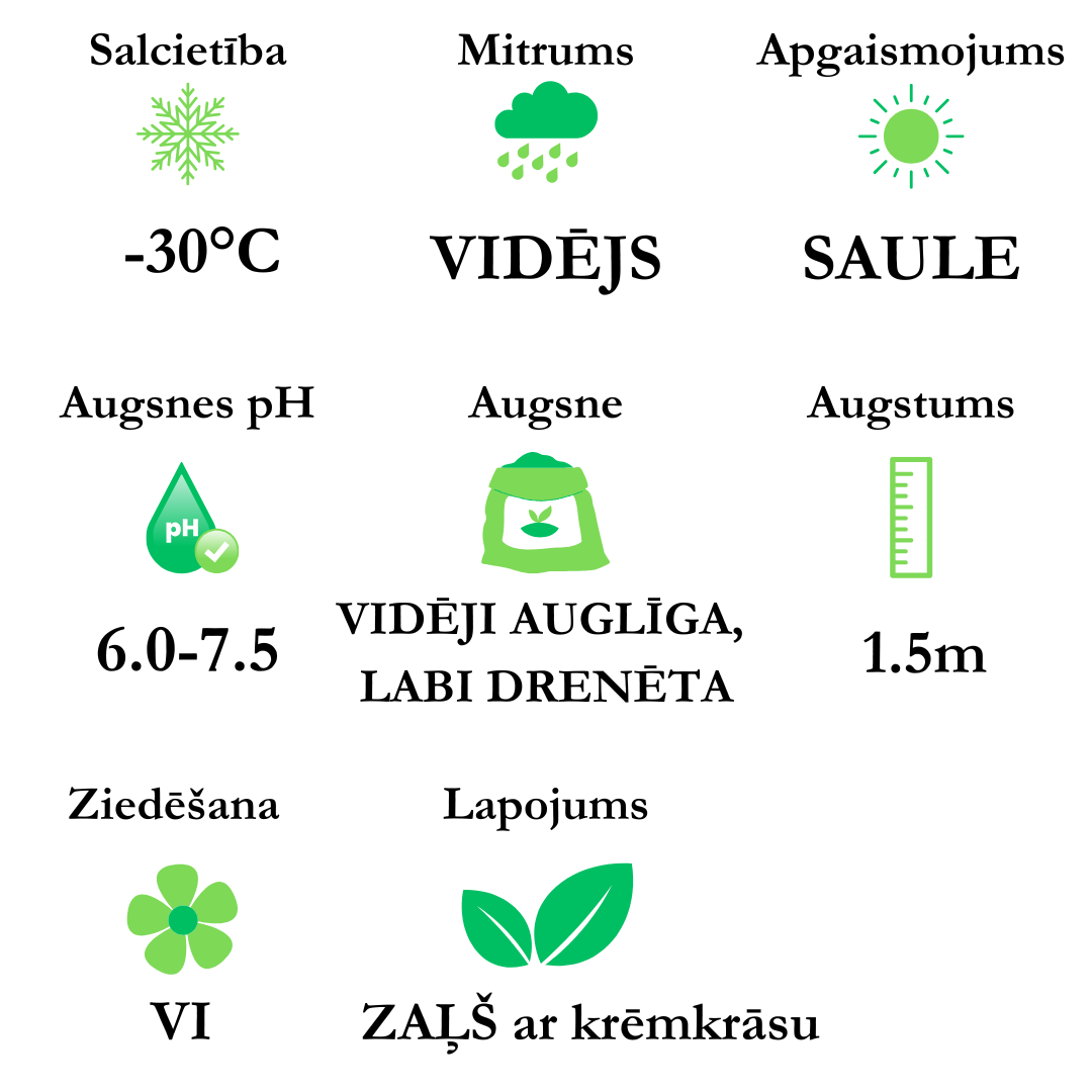 Lapojums - zaļš ar krēmkrāsas lāsojumu. Rudenī krāsojas dzeltenīgos zelta toņos.