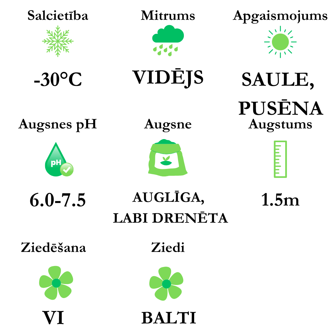 Ziedi - sniegbalti, daļēji pildīti, viegli smaržīgi. Zied jūnijā.