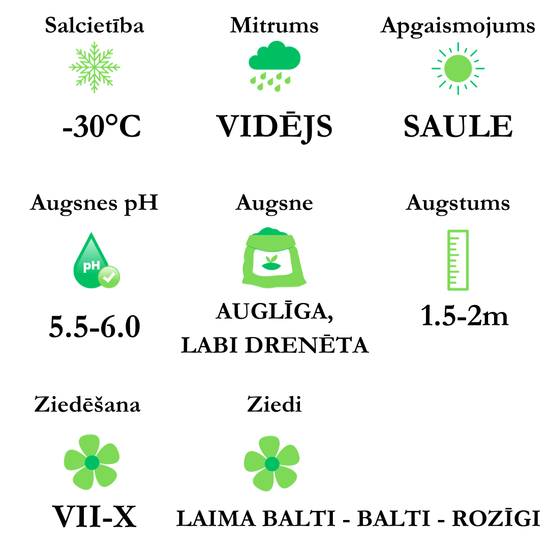 Ziedi - sākotnēji laima nokrāsas ziedi, tad krēmbalti, līdz vasaras beigās ziedi iegūst rozā sārtumu. Ziedkopas lielas, sterilas, sasniedz 25-30cm garumu. Zied no jūlija līdz salnām.