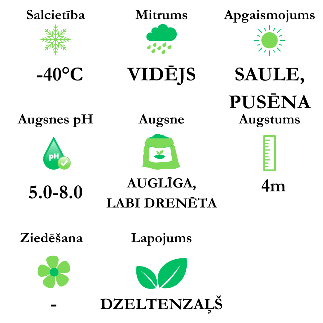 Lapojums - piesātināti dzeltenzaļš (saulainā vietā būs izteikti dzeltens)
